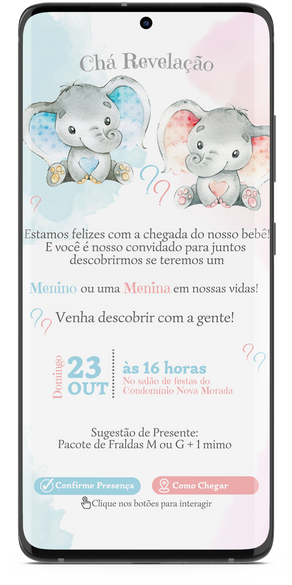Devido a diferença entre os modelos de celulares presentes no mercado, bem como de sistemas operacionais (IOS, Android...), ou falta de conexão de internet, não nos responsabilizamos por falhas pontuais na visualização do convite e/ou abertura dos links interativos.