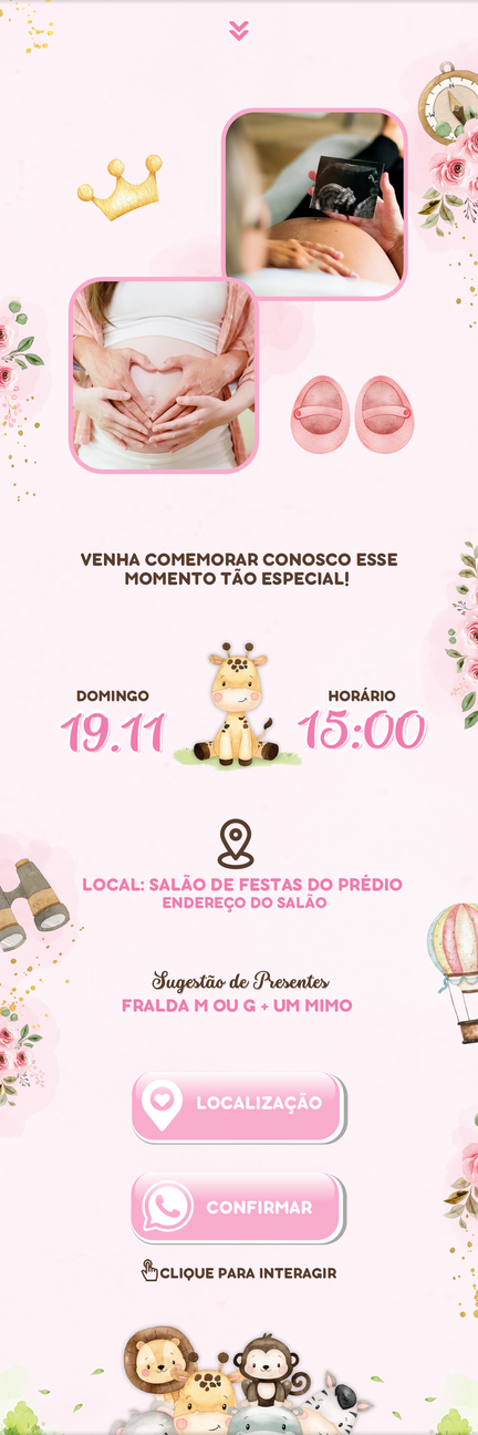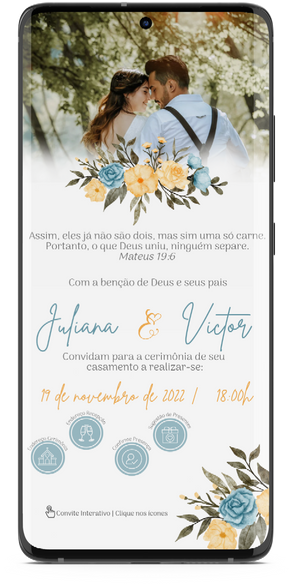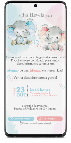 Devido a diferença entre os modelos de celulares presentes no mercado, bem como de sistemas operacionais (IOS, Android...), ou falta de conexão de internet, não nos responsabilizamos por falhas pontuais na visualização do convite e/ou abertura dos links interativos.